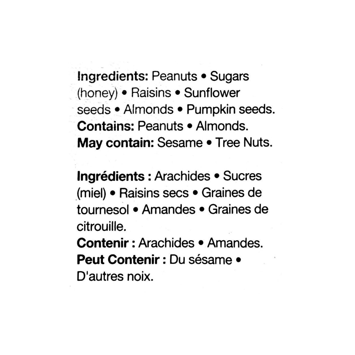 Peanuts, Honey, Raisins, Sunflower Seeds, Almonds, Pumpkin Seeds.