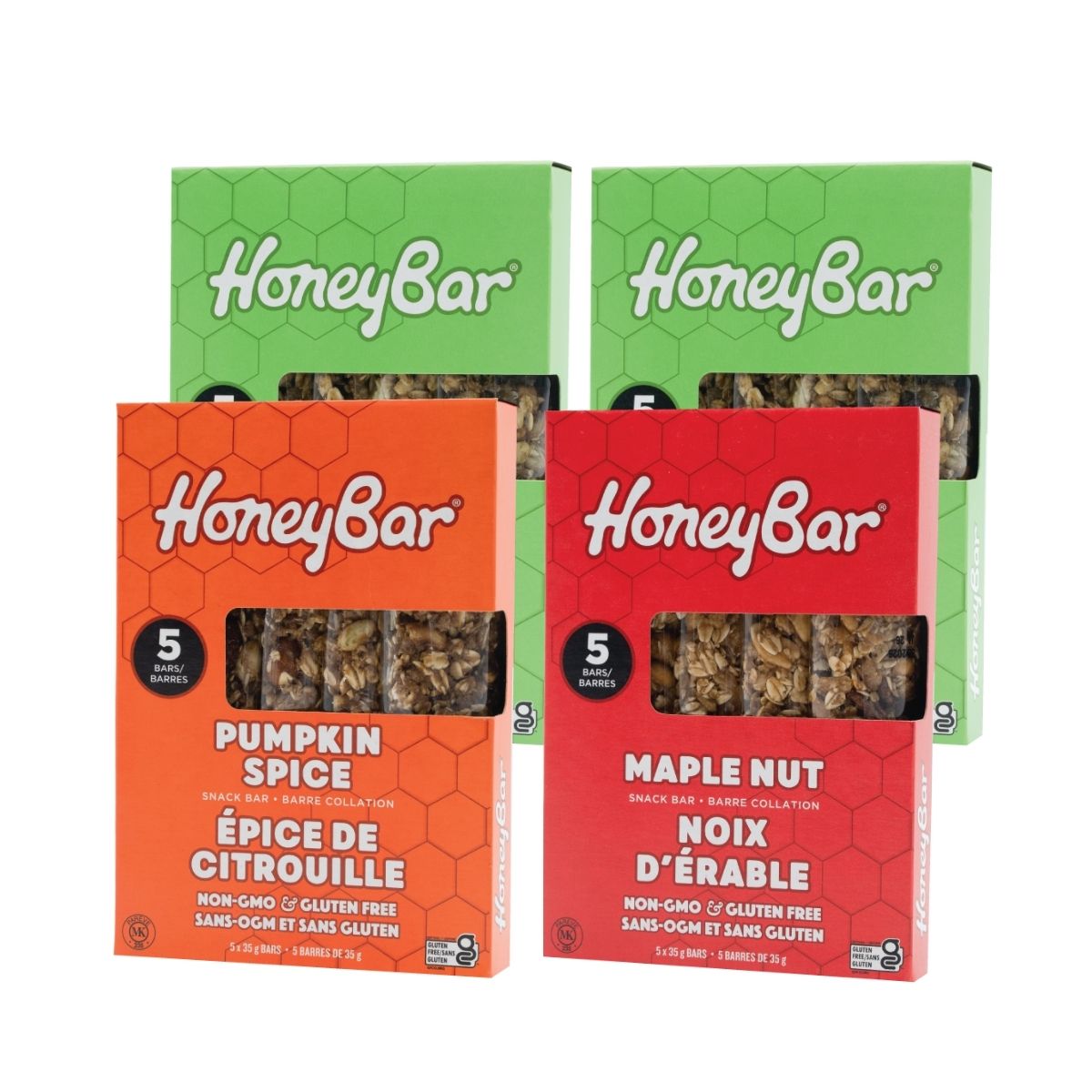 Mix and match 4 boxes of the new 5 count HoneyBar flavours! Choose from Maple Nut, Caramel Apple and Pumpkin Spice.