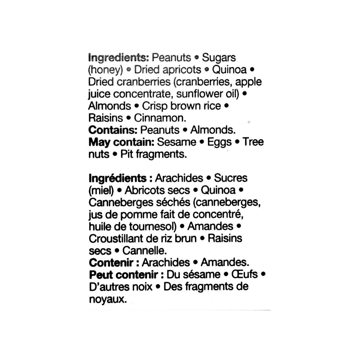 Peanuts, Honey, Dried Apricots, Quinoa, Dried Cranberries (Cranberries, Apple Juice Concentrate, Sunflower Oil), Almonds, Crisp Brown Rice, Raisins, Cinnamon.
