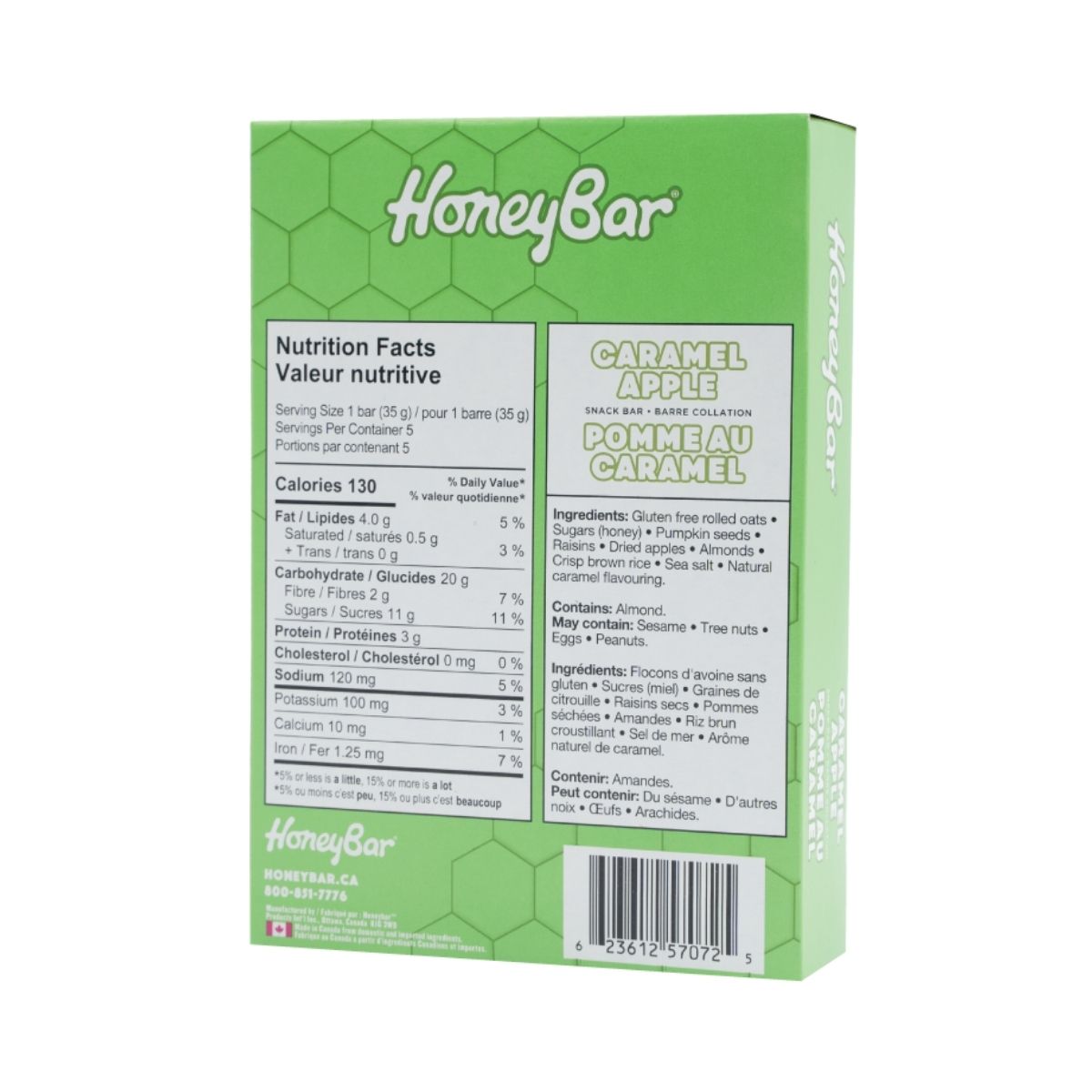 Caramel Apple: Gluten free rolled oats, Sugars (honey), Pumpkin seeds, Raisins, Dried apples, Almonds, Crisp brown rice, Sea salt, Natural caramel flavouring