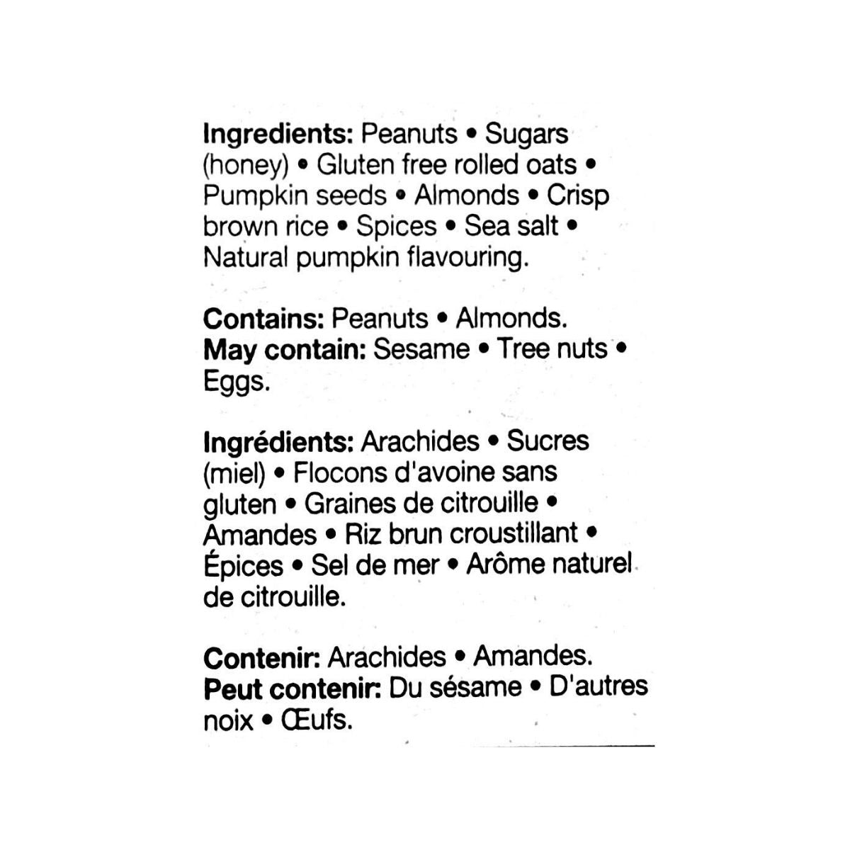 Peanuts, Sugars (honey), Gluten free rolled oats, Pumpkin seeds, Almonds, Crisp brown rice, Spices, Sea salt, Natural pumpkin flavouring